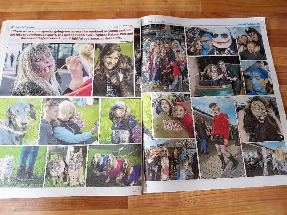 Sticking with Halloween, we went to Hove Park last Saturday morning for Howl-o-ween Brighton. A festival organised by a local company with stalls for you to walk around, a fashion parade of doggie Halloween costumes and they were attempting to break the Guinness World Record for the number of dogs wearing bandanas. We arrived just after 9.30am (the event was due to start around 10am) and sad to see only a few other doggies (mostly Dachshunds). Never mind, in our usual fashion we were early. So we had a wander around the market stalls that were there and I bought the hounds some Halloween themed bandanas. There was a whole schedule of events due to take place between 10am and 5pm. However at around 11.30am there were still not an awful lot of people around and also we realised that our parking was soon to run out (the drawback of parking in Hove). The schedule was clearly not on time so we knew we were not going to be able to hang around for the record attempt so we left. It did get me thinking though, we live in Sussex, one of the most over-crowded counties in the country, so why are these events so poorly attended? It’s such a shame when so much effort has gone into organising them and there are very few events like this at the weekend that you can enjoy with your doggies. So why do people not go? Is it because you had to pay to get in? It was only £5 each and £1 of that was going to Dogs Trust. Is it because people think that there will be too many other people there? Is it just that people cannot be bothered? I will continue to go to and support events like this because for me, the more things you can do with your doggies, the better. I understand they were hoping to get at least 1000 doggies there but according to the local newspaper report, around 200 actually turned up. I’m not sure whether they beat the record, I think they’re still waiting for the result, however I really hope they didn’t miss out by just 3 dogs or I’m going to feel awful for having to leave! At least the hounds had another moment of fame by appearing in The Argus on Monday! Not in fancy dress but in their very snazzy Equafleece jumpers!