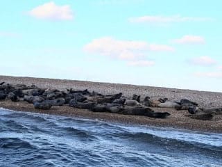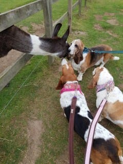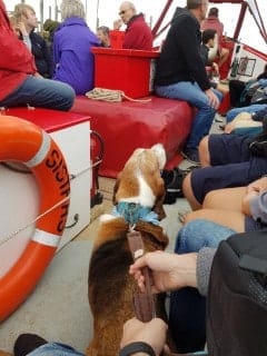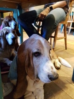 One of our last trips was a true gem. We went on a fishing boat trip from Blakeney Harbour out to Blakeney Point seal spotting. It was approximately an hour’s trip on the boat and back and we saw loads of seals which was fantastic. The Captain of the boat was very impressed at the Hounds’ behaviour. The only difficulty is that they clearly allow a certain amount of space per person on the boat not allowing for the fact that one Basset Hound who decides to lay out stretched can take up the space of three humans! Plus of course, multiply that by three and you see the problem. The young couple that sat next to us on the boat were rather taken with our white-faced old gentleman Buddy-Love who was leading the charge in stretching out on the floor of the boat as far as he could! During a conversation with them, I noticed that Buddy had left a rather large slobber on the man’s knee and he had shorts on! His wife was laughing and took out a tissue to wipe it off. Obviously, this hadn’t phased her at all but I’m not so sure about her husband! Trust Buddy!